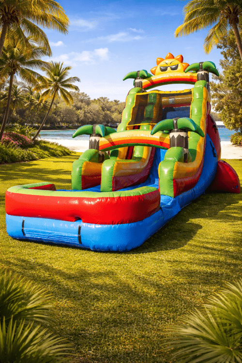 Turn up the excitement at your next event with our 18ft Sunshine Paradise Waterslide Rental, one of the most thrilling waterslide rentals in Burton, Flint, and Genesee County, Michigan. Standing an impressive 18 feet tall, this vibrant tropical inflatable delivers fast sliding action, refreshing splashes, and nonstop summer fun for kids and adults alike.